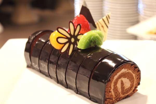 Pour servir, couper des tranches d’environ 1 cm d’épaisseur et décorer avec des fruits et des décorations au chocolat au choix.
