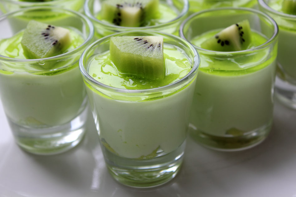 Avant de servir, ajouter une couche de coulis de kiwi, et décorer avec des morceaux de kiwis.
